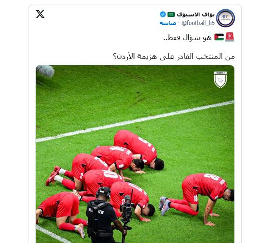 كما علّق حساب نواف الآسيوي على "إكس": "هو سؤال فقط.. من المنتخب القادر على هزيمة الأردن؟".
