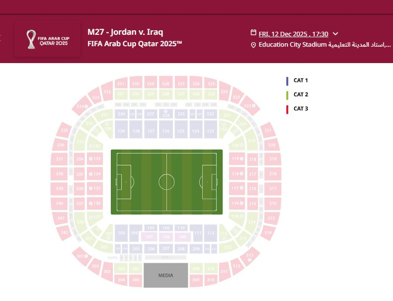 ملاعب - أعلن عبر الموقع الرسمي للاتحاد الدولي لكرة القدم عن نفاد تذاكر مواجهة النشامى والعراق والتي ستقام عند الساعة الخامسة والنصف مساء الجمعة الموافق 12-12-2025، على ستاد المدينة التعليمية في مدينة الريان، وذلك ضمن الدور ربع النهائي لبطولة كأس العرب 2025.
