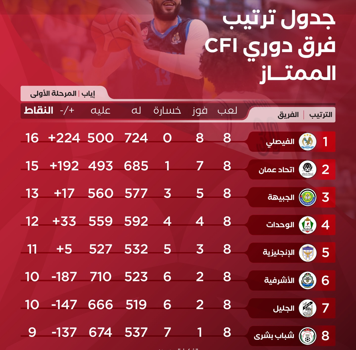 ومع نهاية الجولة الثامنة تصدر النادي الفيصلي جدول ترتيب الدوري بالعلامة الكاملة بعد أن حقق الفوز في جميع مبارياته.