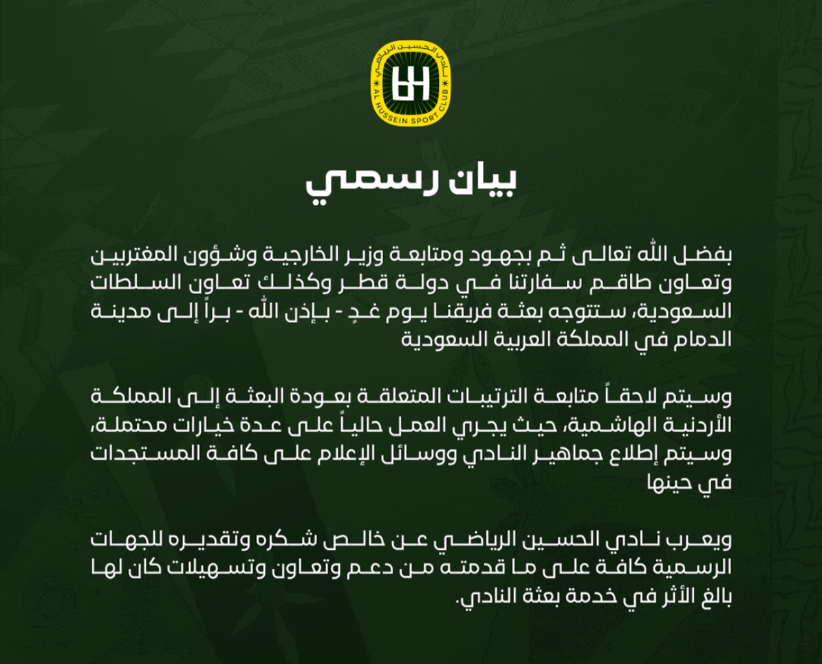 ملاعب - أصدر نادي الحسين بيانا رسميا بشأن عودة الفريق لأرض الوطن .
