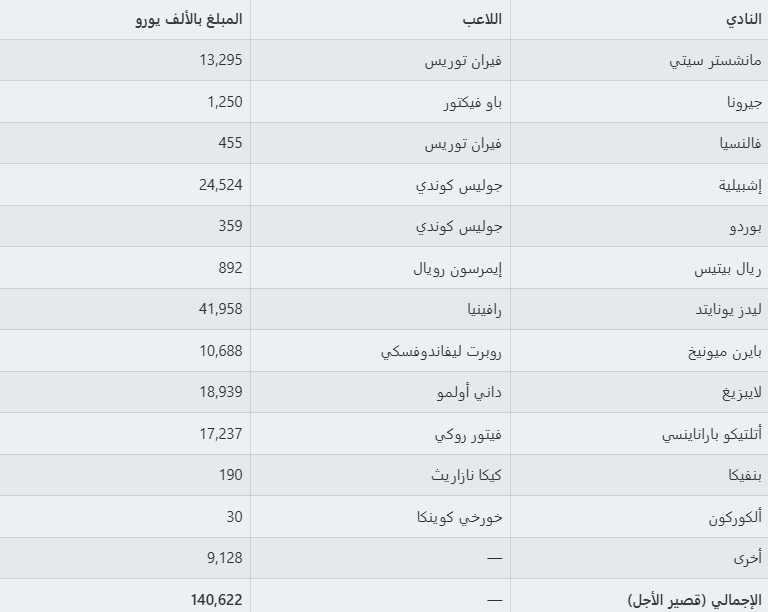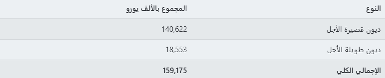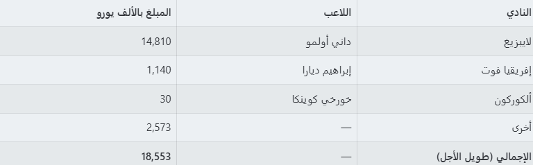 ويُظهر التقرير أن إجمالي الديون مع الأندية الرياضية بلغ 159.2 مليون يورو، منها 140.6 مليون يورو ديون قصيرة الأجل و18.5 مليون يورو ديون طويلة الأجل.