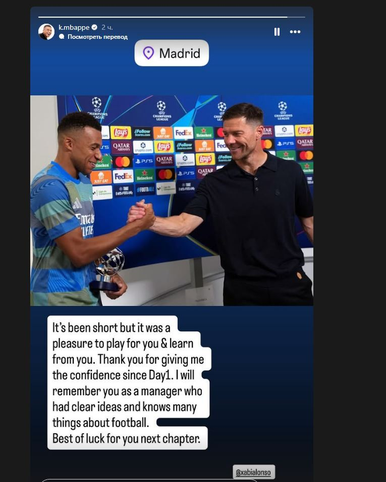 وكان كيليان مبابي أول لاعب في ريال مدريد يودع تشابي ألونسو بعد إعلان النادي خلال الساعات الماضية إنهاء فترة توليه منصب مدرب الفريق بالتراضي، وتعيين ألفارو أربيلوا، مدرب الفريق الرديف، كمدير فني خلفا لألونسو.