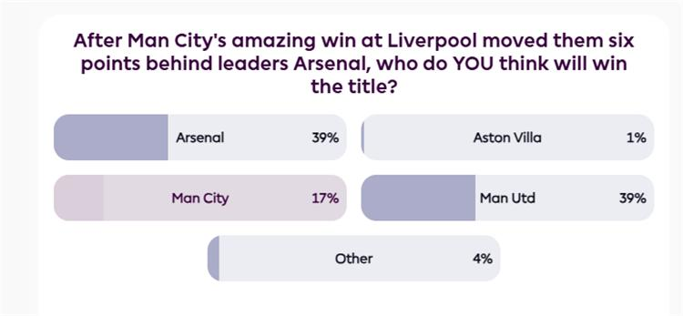 وتحصل آرسنال على نسبة 39 % في تصويت الجماهير حتى الآن، ولكن المثير للدهشة هو اختيار مانشستر يونايتد كفائز متوقع للقب الدوري الإنجليزي بنفس المعدل.
