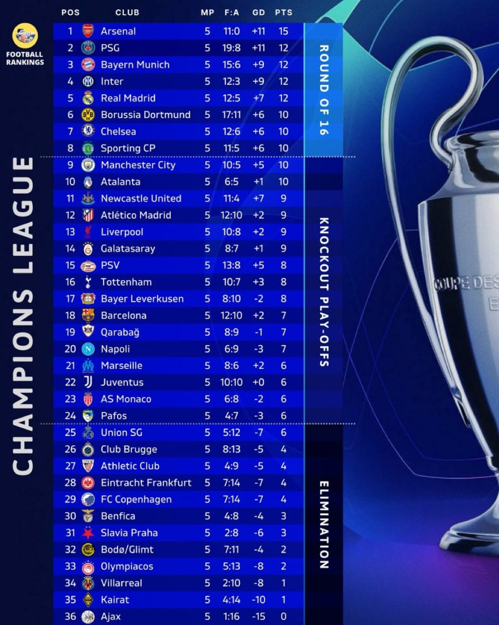 ملاعب - انتهت مباريات الجولة الخامسة من دور المجموعات في دوري ابطال اوروبا بتصدر ارسنال لترتيب البطولة بعد ان تمكن من الحفاظ على سجله بدون اي هزيمة حتى الان وينجح في حصد كامل نقاطه ال 15.