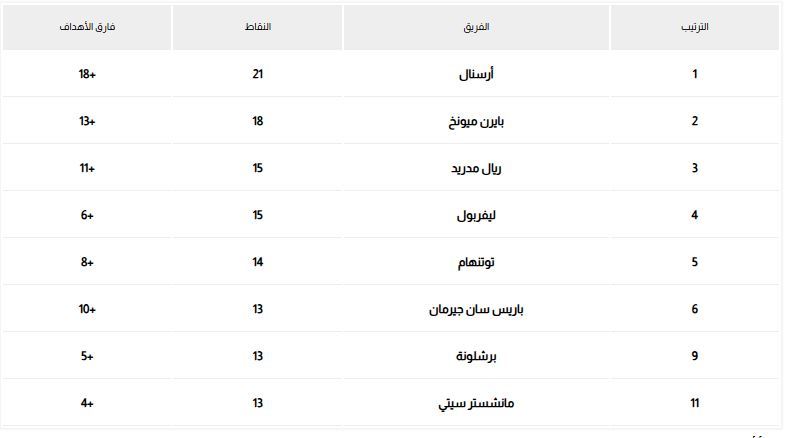 ملاعب - شهدت الجولة السابعة من بطولة دوري ابطال أوروبا تحولات محورية في مراكز القوى الأوروبية، حيث استمر أرسنال في تقديم نسخة "تاريخية" محققاً 21 نقطة من 7 مباريات، متصدراً بفارق 3 نقاط عن الوصيف بايرن ميونخ.