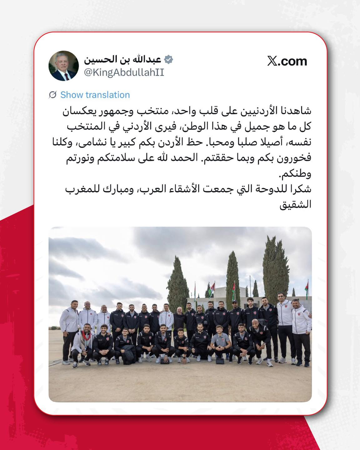وقال جلالة الملك في منشور على منصة " اكس" "شاهدنا الأردنيين على قلب واحد، منتخب وجمهور يعكسان كل ما هو جميل في هذا الوطن، فيرى الأردني في المنتخب نفسه، أصيلا صلبا ومحبا. حظ الأردن بكم كبير يا نشامى، وكلنا فخورون بكم وبما حققتم. الحمد لله على سلامتكم ونورتم وطنكم. شكرا للدوحة التي جمعت الأشقاء العرب، ومبارك للمغرب الشقيق".