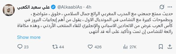 ملاعب - نشر المعلق الرياضي الاماراتي علي سعيد الكعبي تغريدة على موقع التواصل الاجتماعي (X) تتضمن حديثه مع مدرب منتخبنا الوطني لكرة القدم جمال سلامي.