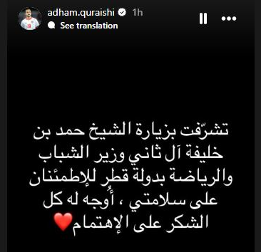 ونشر القريشي على موقع التواصل الاجتماعي انستغرام "ستوري" شكر فيها الوزير القطري على الزيارة والاهتمام الذي يلقاه بدولة قطر.