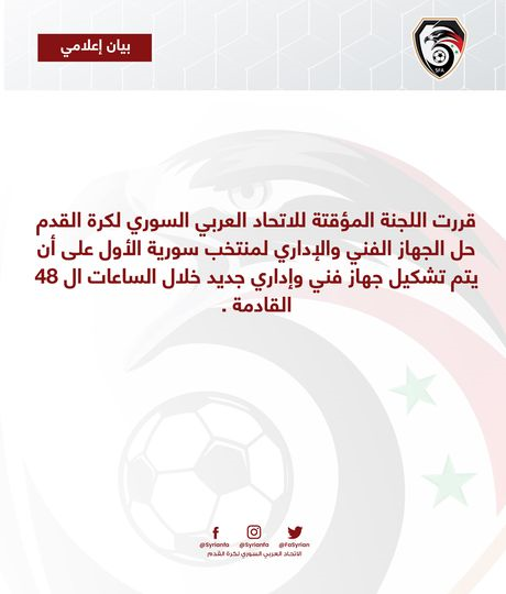 وجاء في بيان الاتحاد السوري: "قررت اللجنة المؤقتة للاتحاد السوري لكرة القدم حل الجهاز الفني والإداري لمنتخب سوريا الأول على أن يتم تشكيل جهاز فني وإداري جديد خلال الساعات الـ48 القادمة".