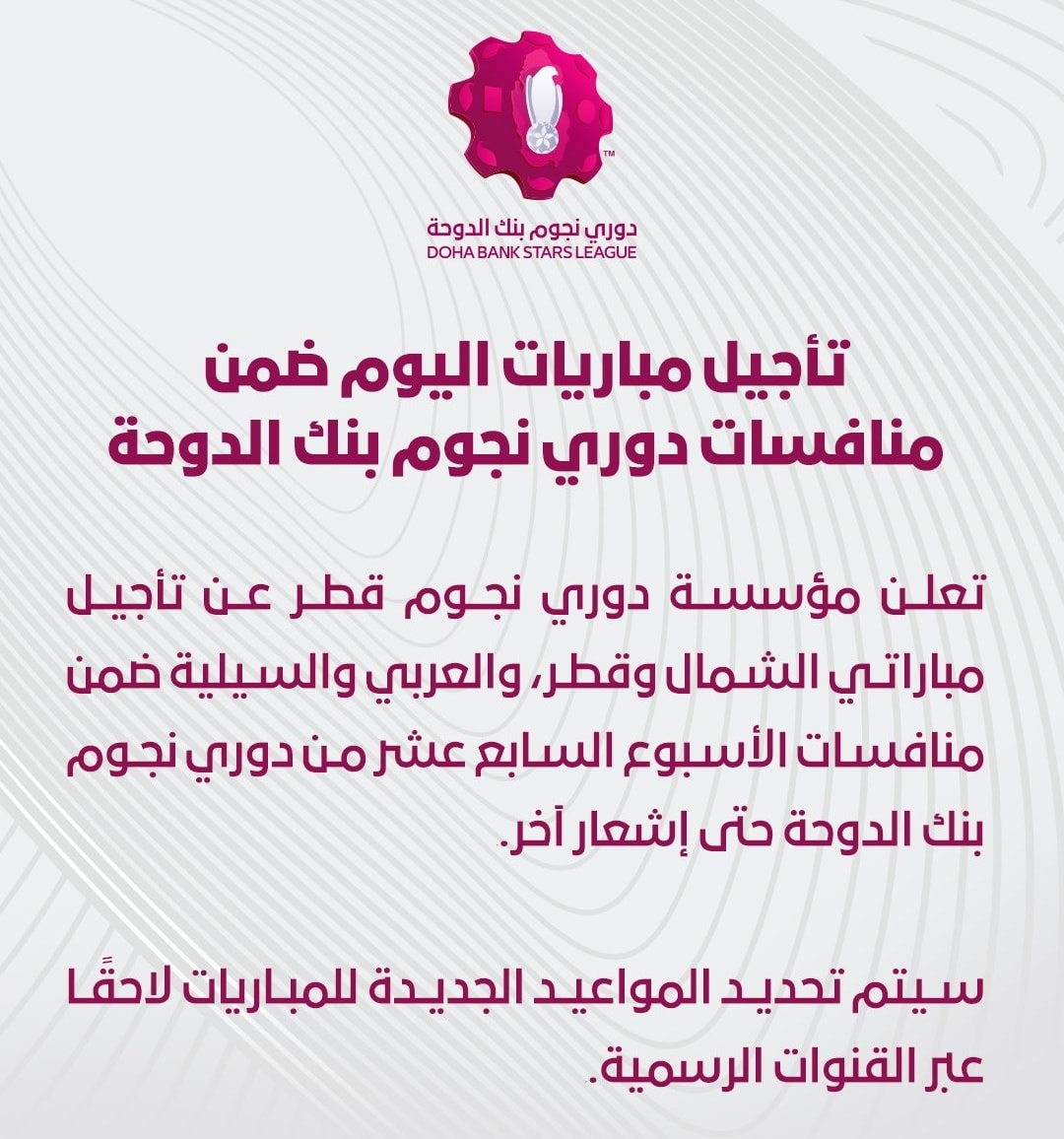 ملاعب - أعلنت مؤسسة دوري نجوم قطر، السبت، تأجيل مباراتي الشمال ضد قطر، والعربي ضد السيلية، ضمن منافسات الجولة 17 من دوري نجوم بنك الدوحة لموسم 2025-2026، حتى إشعار آخر.