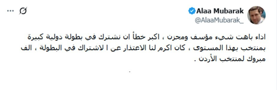 ملاعب - علق علاء مبارك نجل الرئيس المصري الراحل محمد حسني مبارك على الخروج المبكر لمنتخب مصر من بطولة كأس العرب 2025 في قطر، معربا عن استيائه من أداء الفريق.