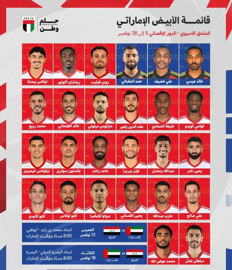ويلتقي منتخب الإمارات مع نظيره العراقي، يوم الخميس الموافق 13 نوفمبر الجاري في إستاد محمد بن زايد بالعاصمة أبوظبي، الساعة 8 مساء بتوقيت أبوظبي، وكذلك يوم الثلاثاء 18 من الشهر نفسه في إستاد البصرة الدولي بالعراق.
