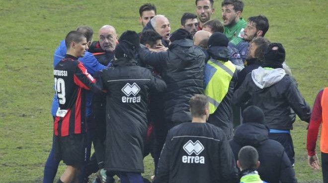 وأظهرت لقطات للمباراة المدرب الإيطالي حليق الرأس جيانكارلو فافارين خلال شجار مع جايتانو مانشينو مساعد مدرب فريق أليساندريا المنافس في نهاية المباراة التي انتهت بالتعادل 2-2 يوم الأحد، وفقد مانشينو توازنه وسقط على الأرض من قوة الضربة.