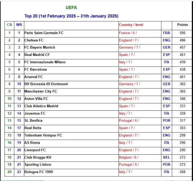 وجاءت قائمة أفضل خمسة أندية في القارة الأوروبية (والعالم) على النحو التالي: احتل سان جيرمان المركز الأول، وتبعه تشيلسي الإنجليزي ثانياً، ثم بايرن ميونخ الألماني ثالثاً، وحل ريال مدريد الإسباني رابعاً، بينما جاء إنتر ميلان الإيطالي في المركز الخامس.