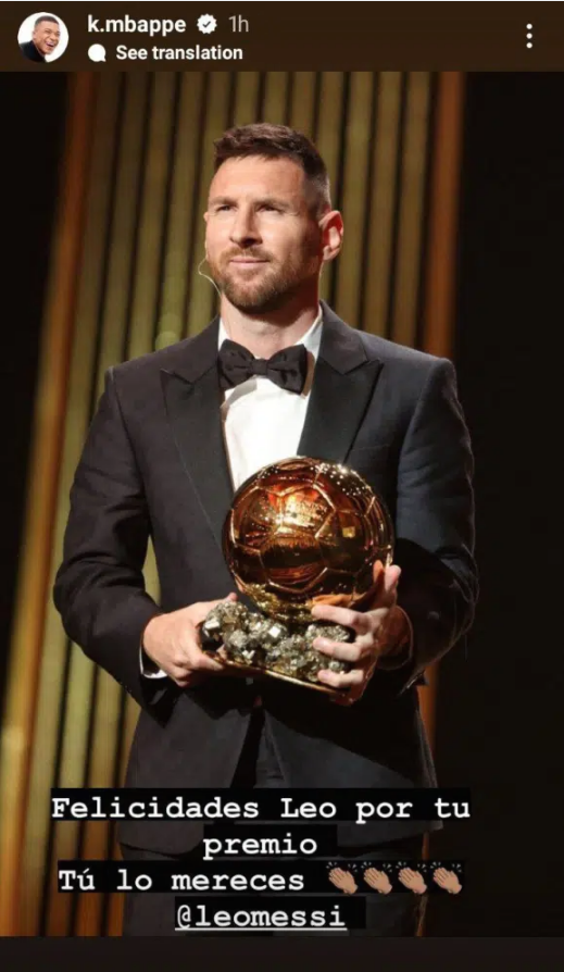 ونشر مبابي عبر حسابه الشخصي على موقع التواصل الاجتماعي "إنستغرام"، صورة لزميله السابق في سان جيرمان ميسي، وهو يحمل الكرة الذهبية، وعلق عليها: "تهانينا ليو على الجائزة، أنت تستحقها".