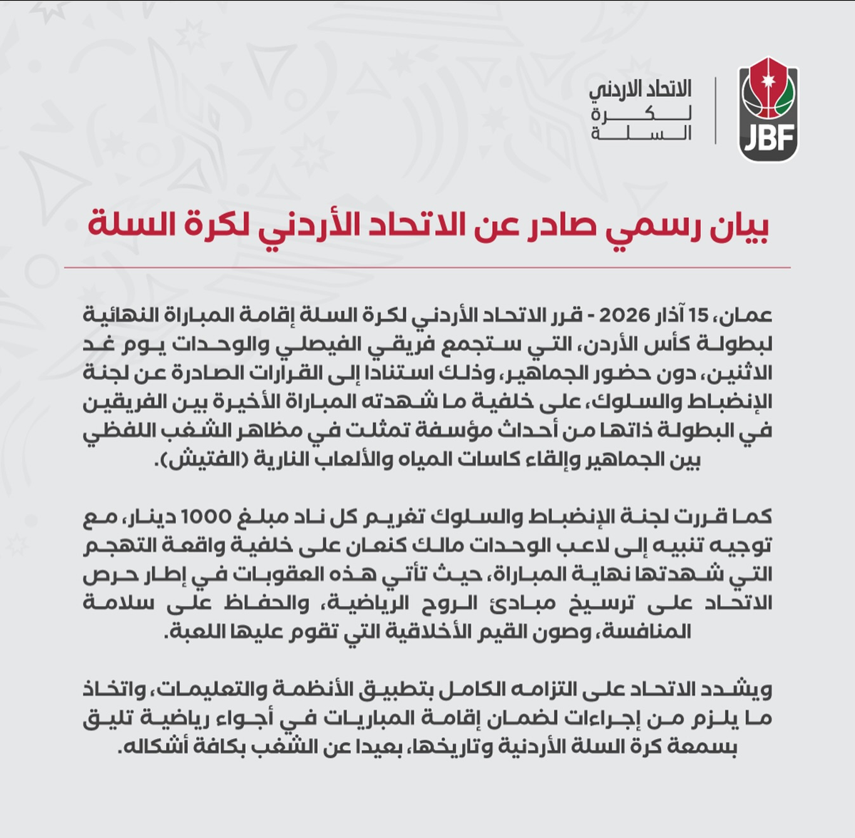 ملاعب - أصدر الاتحاد الأردني لكرة السلة قراراً يتعلق بالمباراة النهائية لبطولة كأس الأردن لكرة السلة بين الفيصلي والوحدات والذي يقام يوم الاثنين على صالة الأمير حمزة بمدينة الحسين للشباب بدون الحضور الجماهيري.