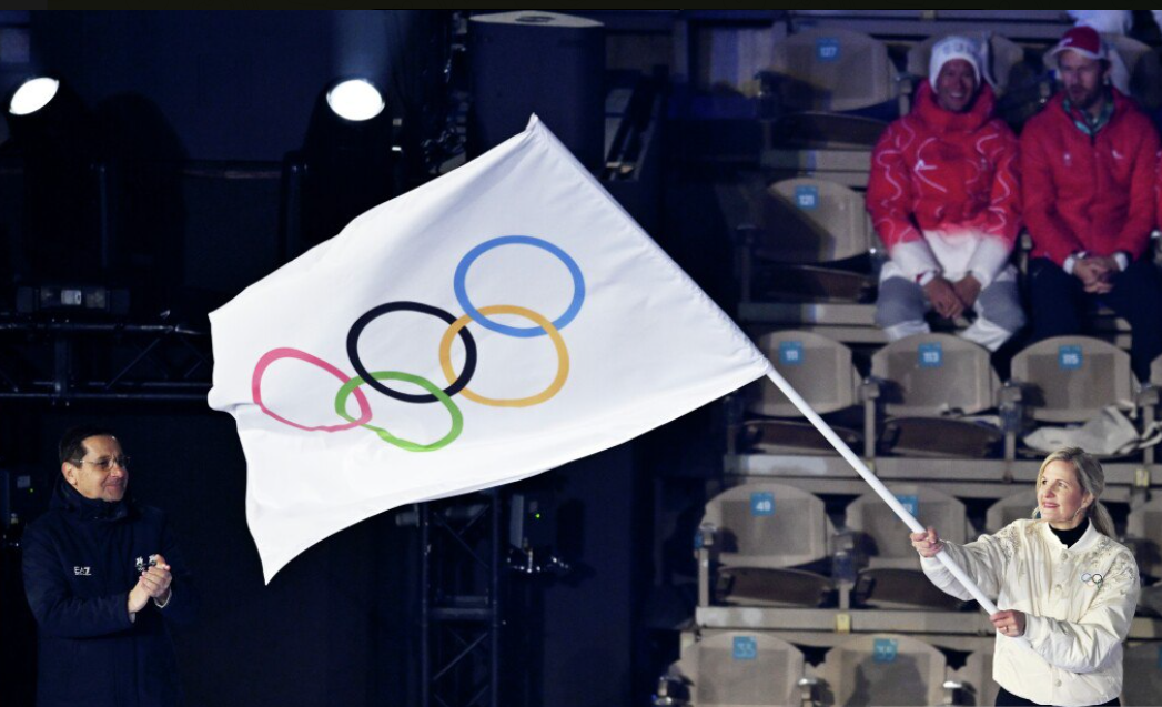 واستمر حفل الختام لمدة ساعتين ونصف الساعة، اختتم بتسليم العلم الأولمبي من المسؤولين الإيطاليين إلى ممثلي جبال الألب الفرنسية، التي ستستضيف دورة الألعاب الأولمبية الشتوية المقبلة عام 2030، في مراسم تقليدية ترمز لانتقال الروح الأولمبية من مضيف إلى آخر.