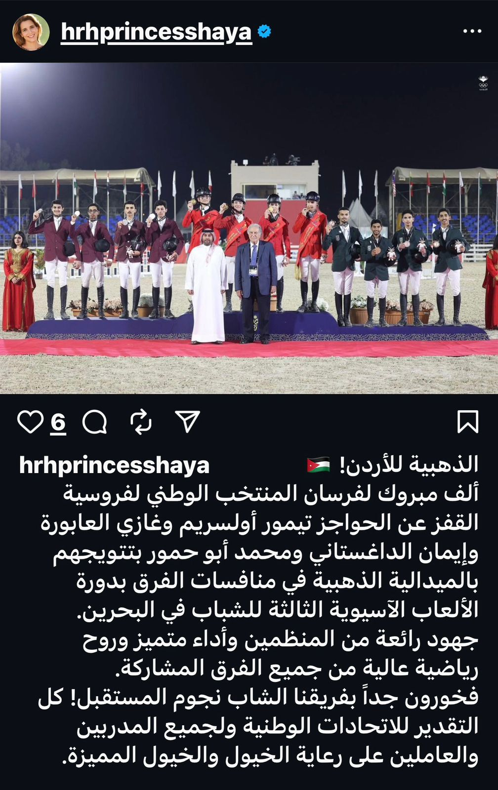 وقالت سموها في منشور على منصة (إنستغرام) اليوم، "ألف مبروك لفرسان المنتخب الوطني لفروسية القفز عن الحواجز: تيمور أولسم، وغازي العابورة، وإيمان الدغستاني، ومحمد أبو حيمور، بتتويجهم بالميدالية الذهبية في منافسات الفرق بدورة الألعاب الآسيوية الثالثة للشباب في البحرين. جهود رائعة من المنظمين، وأداء متميز، وروح رياضية عالية من جميع الفرق المشاركة".
