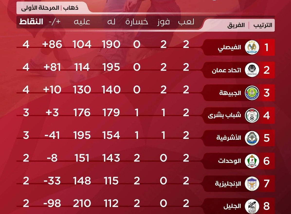 ملاعب - تصدر النادي الفيصلي جدول ترتيب الدوري الاردني لكرة السلة بعد نهاية الجولة الثانية ضمن مرحلة الذهاب.