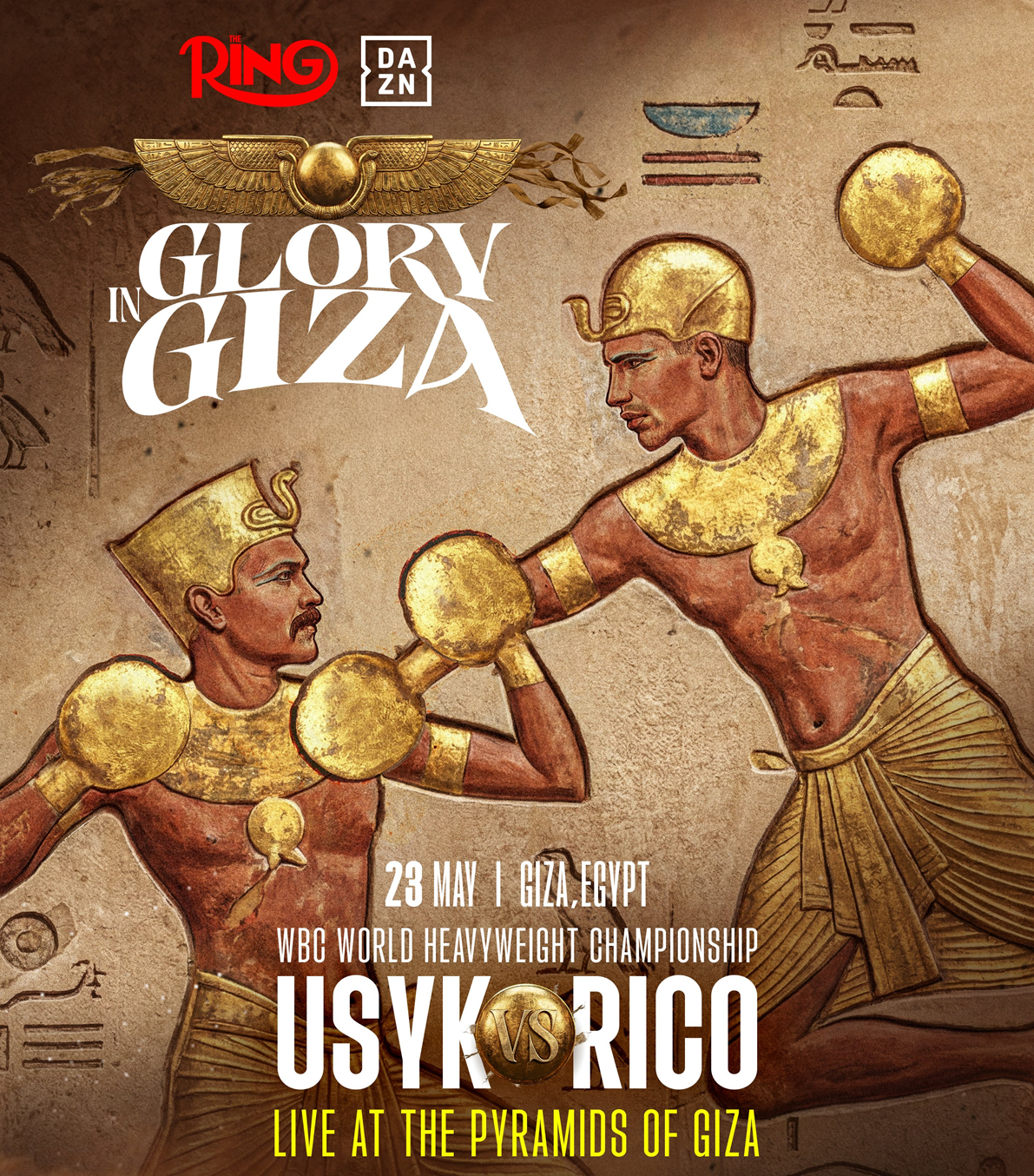 ويقام الحدث تحت عنوان (Glory in Giza)، ويجمع النزال الرئيسي بطل الوزن الثقيل الموحد الأوكراني أوليكساندر أوسيك (حقق 24 انتصارا دون هزيمة، 15 بالضربة القاضية) وبطل الكيك بوكسينغ السابق الهولندي ريكو فيرهوفن، وذلك يوم السبت 23 مايو المقبل، في مصر، على لقب المجلس العالمي للملاكمة (WBC) للوزن الثقيل، في بث حصري عالمي عبر منصةDAZN .