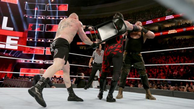 ففي الحدث الأبرز، استطاع #بروك_ليسنر النجاة من الهزيمة على يدي #برون_سترومان و #كين في نزال ثلاثي جمع بينهم على لقب "اليونفيرسال"، وذلك بعد أن استطاع "الوحش" ليسنر تثبيت كين بحركة "أف فايف" ليفوز باللقاء و يحافظ على لقبه، رغم أن المؤشرات الأولية كانت ترجح كفة "القاطرة" برون سترومان للفوز بالنزال.