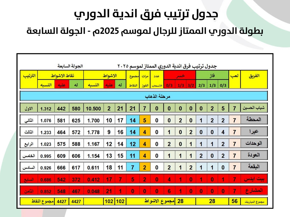 ملاعب - احتل فريق شباب الحسين صدارة ترتيب مرحلة ذهاب الدوري الممتاز للكرة الطائرة بعد انتهاء الجولة السابعة والأخيرة، وذلك عقب نتائجه في المباريات التي اقيمت امس.
