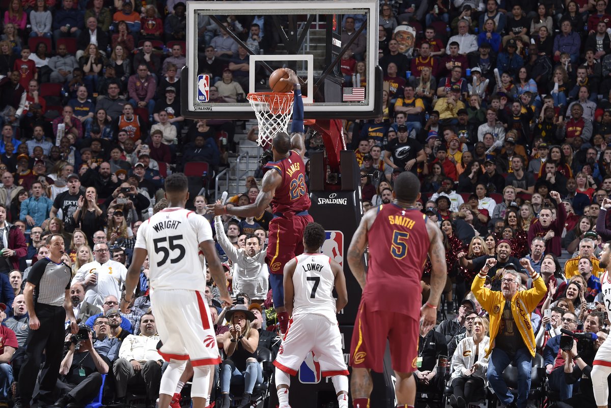 وأحرز جيمس 35 نقطة ومرر 17 كرة حاسمة ولم يفقد الكرة نهائيا في المباراة وأضاف زميله كيفن لاف 23 نقطة، واكتفى كايل لوري بتسجيل 24 نقطة لرابتورز وأحرز زميله ديمار ديروزان 21 نقطة، وظلت المباراة متكافئة إلى أن وسع #رابتورز الفارق في نهاية الربع الثاني إلى 15 نقطة.