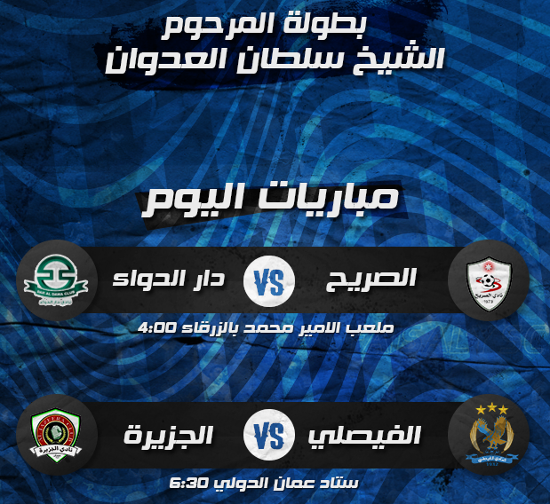 وضمن نفس البطولة يلتقي فريق دار الدواء ونادي الصريح عند الرابعة والنصف عصرا على ستاد مدينة الامير محمد بالزرقاء .