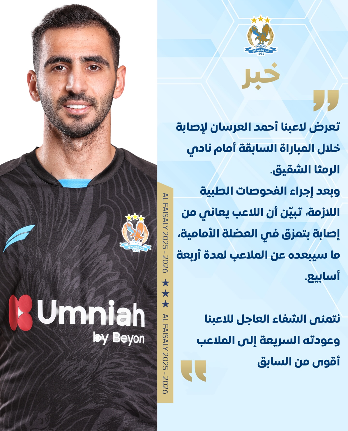 ملاعب - أعلن النادي الفيصلي عن اصابة اللاعب أحمد العرسان خلال المواجهة الاخيرة أمام الرمثا ضمن بطولة الدوري الاردني للمحترفين.