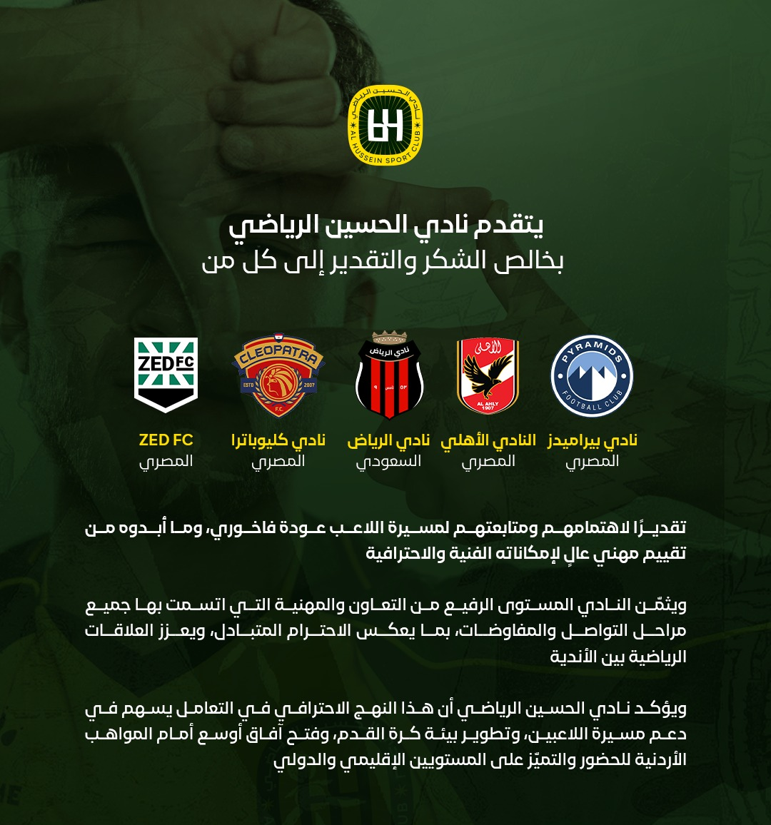 ملاعب - يتقدم نادي الحسين الرياضي, ممثلاً برئيسه المهندس عامر أبو عبيد, بخالص الشكر والتقدير إلى كل من: نادي بيراميدز المصري, النادي الأهلي المصري، ونادي الرياض السعودي، ونادي سيراميكا كليوباترا المصري، ونادي ZED المصري، تقديرًا لاهتمامهم ومتابعتهم لمسيرة لاعب النادي عودة فاخوري، وما أبدوه من تقييم مهني عالٍ لإمكاناته الفنية والاحترافية.
