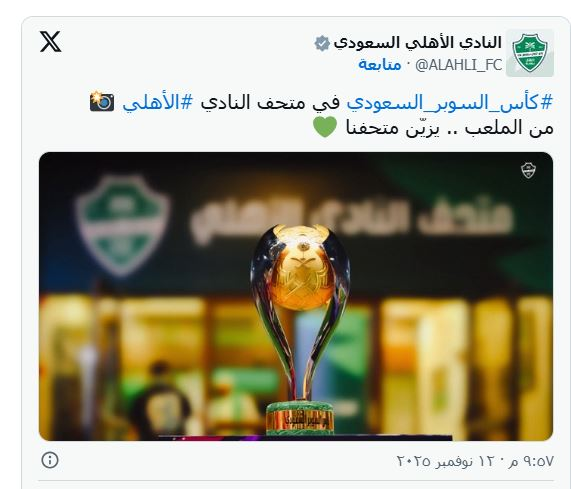 لكن رد النادي الأهلي جاء سريعا وبارزا بعد انتشار هذه الأنباء حيث نشر الحساب الرسمي للنادي على منصة "إكس" صورة لمجسم كأس السوبر السعودي داخل النادي مع التعليق: "كأس السوبر السعودي في متحف النادي الأهلي من الملعب يزين متحفنا".