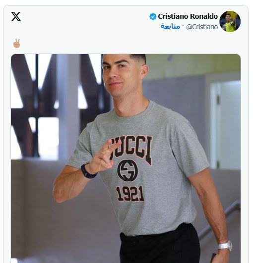 ونشر رونالدو صورة له على حسابه الرسمي على منصة "إكس" اليوم الثلاثاء وهو في مقر نادي النصر السعودي ويرفع علامة النصر.