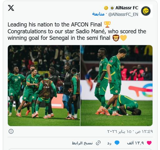 ونشر فريق النصر "العالمي" عبر حسابه على منصة "X" لقطات مصورة من مشاركة ساديو ماني في المباراة، وعلق قائلا: "قاد منتخب بلاده إلى نهائي كأس الأمم الإفريقية، نهنئ نجمنا ساديو ماني، الذي سجّل هدف الفوز للسنغال في نصف النهائي".