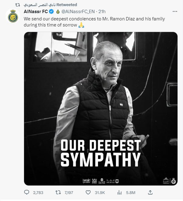 ملاعب - حرص نادي النصر على تعزية مدرب الفريق الأول لكرة القدم بنادي الهلال، رامون دياز، عقب وفاة أحد أفراد عائلته في حادث.
