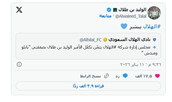 ملاعب - وجه نادي الهلال متصدر دوري "روشن" السعودي لكرة القدم للمحترفين، رسالة شكر إلى رجل الأعمال الأمير الوليد بن طلال، بعد تكفله برسوم صفقتين للفريق خلال سوق الانتقالات الشتوية.