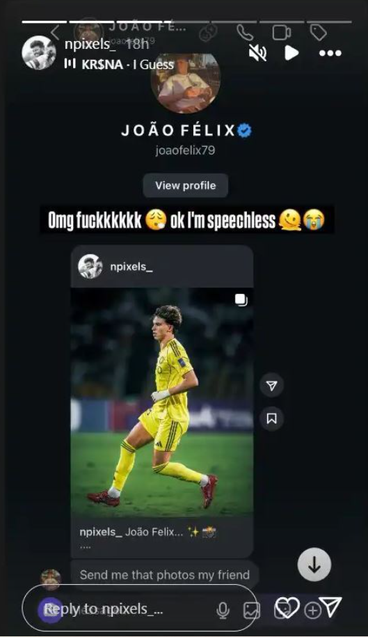 ونشر المصور نيكيل باتيل عبر خاصية "الستوري" على موقع "إنستغرام"، صورة للمحادثة التي بدا خلالها غير مصدق لتواصل جواو فيليكس معه، بعدما طلب منه الأخير إرسال الصور التي التقطها له، والتي يبدو أنه أعجب بها كثيرا.