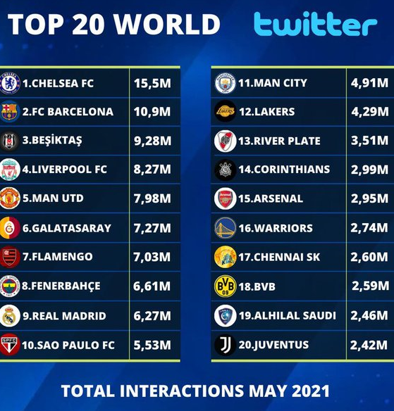 وتم إدراج الهلال ضمن أكثر 20 نادي في العالم تفاعلاً خلال شهر مايو حيث بلغ عدد التفاعلات 2.46 مليون تفاعل، وذلك وفقًا لموقع الإحصاء " Deportes & Finanzas".