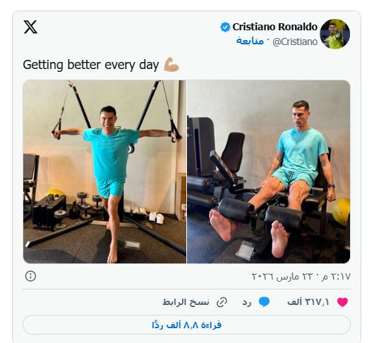 ونشر المخضرم رونالدو، البالغ من العمر 41 عاما، صورا تظهر خضوعه للتدريبات في الصالة الرياضية، وعلق قائلا: "أتحسن يوما بعد يوم".