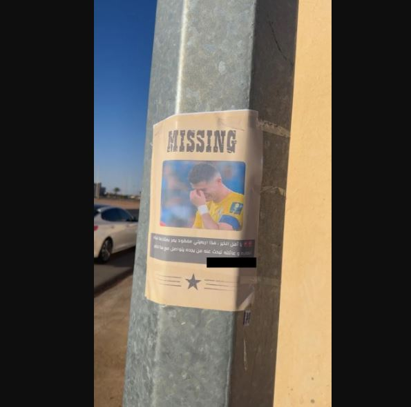 ملاعب - شهدت بعض الشوارع المحيطة بنادي النصر ظاهرة مثيرة للجدل، حيث تداول ناشطون صوراً لمنشورات ورقية تم لصقها على الجدران، تُصوّر النجم البرتغالي كريستيانو رونالدو كشخص "مفقود"، وذلك في إطار حملة ساخرة شنّها بعض المشجعين تعبيراً عن استيائهم من غيابه الأخير عن تدريبات ومباريات ناديه.