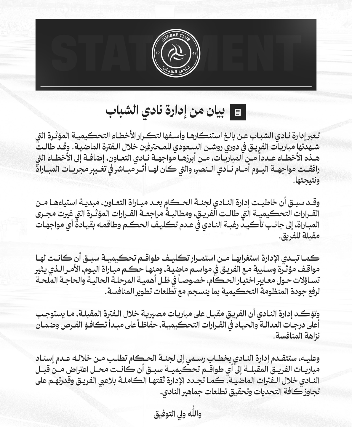 "وعليه، ستتقدم إدارة النادي بخطاب رسمي إلى لجنة الحكام تطلب من خلاله عدم إسناد مباريات الفريق المقبلة إلى أي طواقم تحكيمية سبق أن كانت محل اعتراض من قبل النادي خلال الفترات الماضية، كما تجدد الإدارة ثقتها الكاملة بلاعبي الفريق وقدرتهم على تجاوز كافة التحديات وتحقيق تطلعات جماهير النادي".