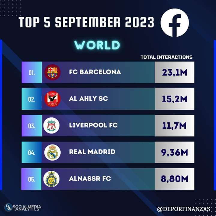 واحتلت الصفحة الرسمية للنادي الأهلي، المركز الثاني على مستوى العالم من حيث التفاعل بواقع 15.2 مليون، خلف نادي برشلونة الإسباني صاحب المركز الأول بواقع 23.1 مليون.