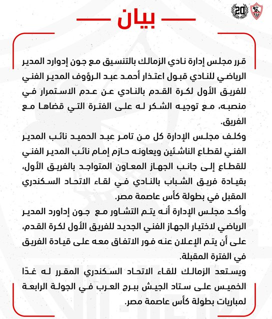 وأشار فريق "الفارس الأبيض" إلى أن مجلس الإدارة يتشاور مع جون إدوارد لاختيار الجهاز الفني الجديد للفريق الأول، على أن يتم الإعلان عنه فور الاتفاق معه على قيادة الفريق خلال المرحلة المقبلة.