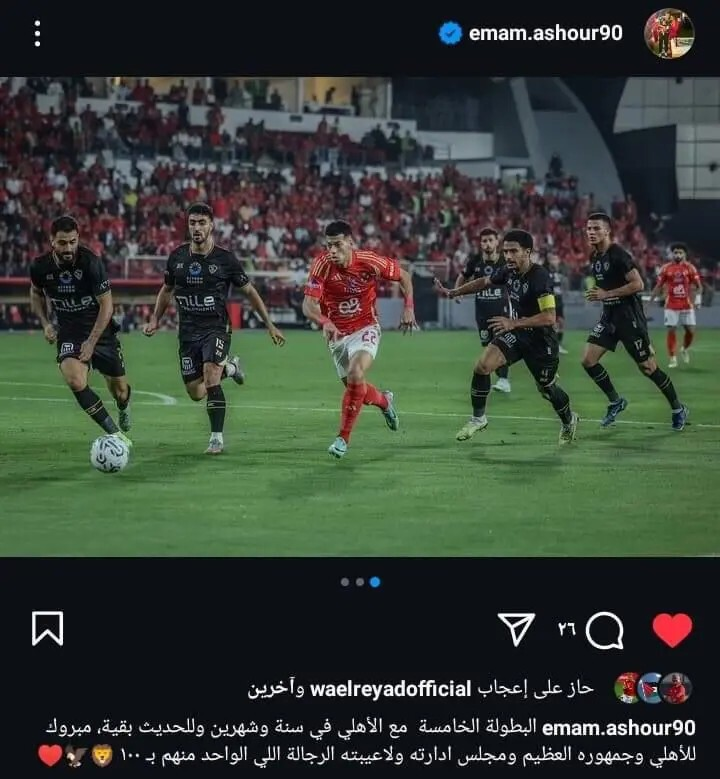 ونشر إمام عاشور صورة له من مباراة السوبر المصري عبر حسابه الرسمي على منصة "إنستغرام" وكتب عليها: "البطولة الخامسة مع الأهلي في سنة وشهرين وللحديث بقية، مبروك للأهلي وجمهوره العظيم ومجلس إدارته ولاعيبته الرجالة اللي الواحد منهم بـ100".