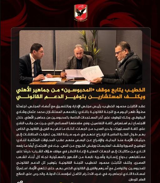 وخلال الاجتماع الذي حضره المستشاران محمد عثمان وشادي البرقوقي، استعرض الخطيب كافة المساعي التي بذلها النادي والجهود القانونية المبذولة للإفراج عنهم في ضوء سيادة القانون.