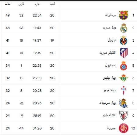 ملاعب - انتهت مباريات الجولة العشرين من منافسات الدوري الاسباني والتي شهدت نتائج مثيرة ابرزها كان سقوط برشلونة امام ريال سوسييداد بهدفين مقابل هدف، وهو ما منح ريال مدريد فرصة تقليص الفارق إلى نقطة بعد فوز الاخير على ليفانتي بثنائية.