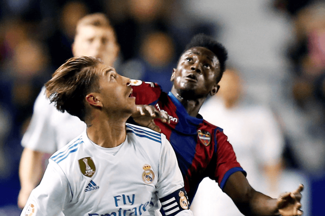 وافتتح "المطرقة" #سيرجيو_راموس التسجيل للنادي الملكي برأسية متقنة عند الدقيقة 11، قبل أن يعدل #ايمانويل_بواتينغ النتيجة لليفانتي في الدقيقة 42، منهيا الشوط الأول بالتعادل الإيجابي بين الفريقين .