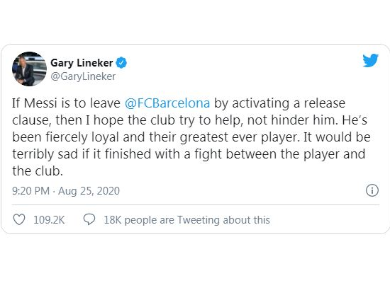 ووصف النجم البرتغالي السابق، لويس فيغو، الذي لعب لبرشلونة وريال مدريد قرار ليونيل ميسي بالتاريخي، بينما أضاف أسطورة كرة القدم الإنكليزية غاري لاينكر "إذ أراد ميسي الرحيل عن برشلونة، على الفريق أن يساعده وألا يقابل وفاءه بالشر، سيكون من المحزن أن تنتهي علاقته مع النادي بطريقة سيئة".