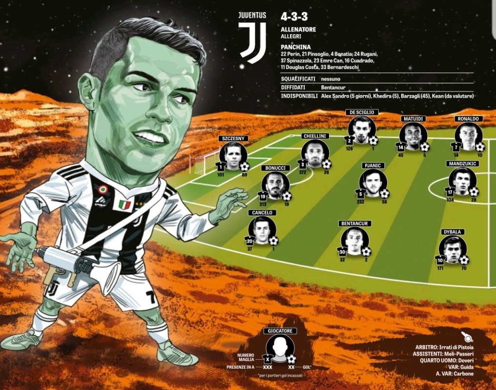 يوفنتوس: تشيزني، ودي تشيليو، و جورجيو كيليني، وبونوتشي، وكانسيلو، وبليز ماتويدي، و بيانيتش، وبنتانكور، وباولو ديبالا ،وكريستيانو رونالدو، وماريو ماندزوكيتش.