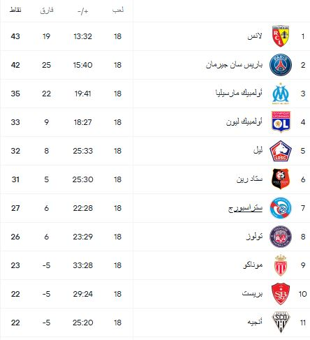 اضافة اعلانترتيب الدوري الفرنسي بعد نهاية الجولة 18 :