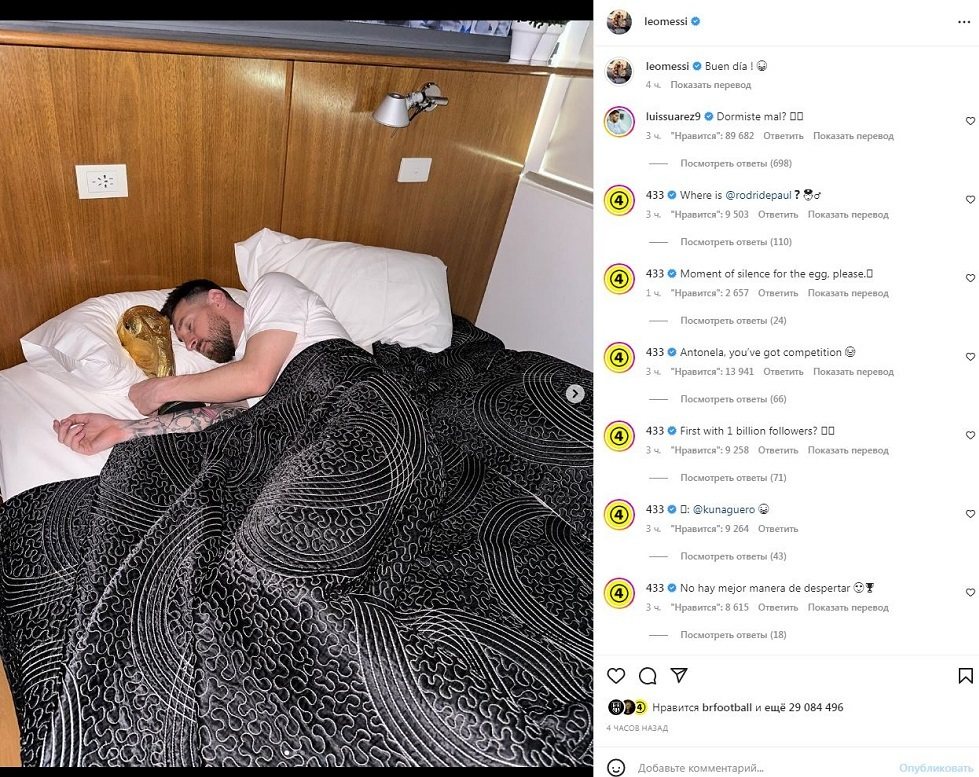 ونشر ميسي صورة له عبر حسابه على موقع "إنستغرام" وهو نائما فيه في السرير وفي حضنه كأس العالم، وعلق عليها: "يوم جيد".